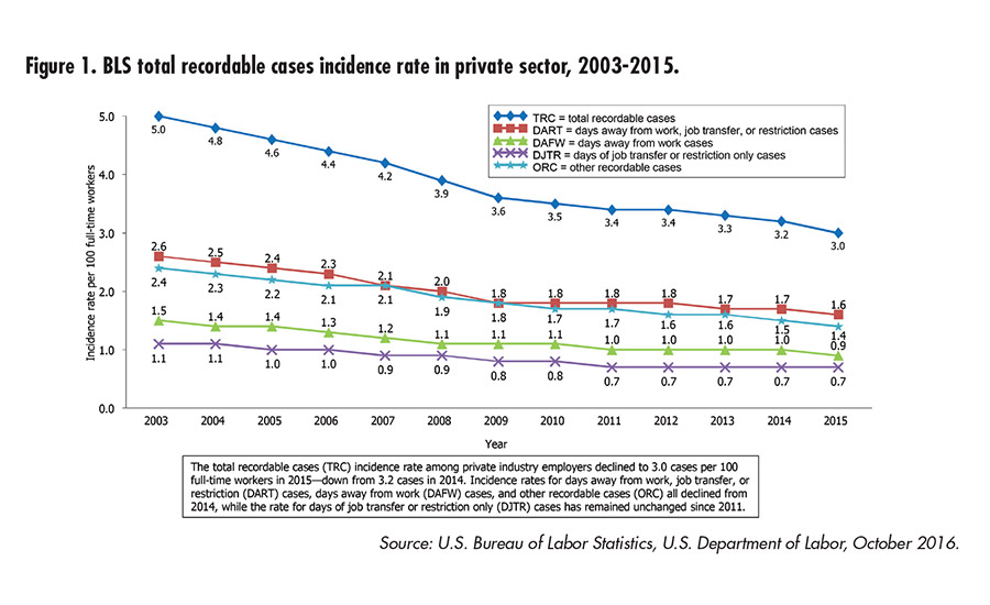 Safety can never be overstated. While safety is typically viewed as a plant concern, that notion is incorrect―and can lead to unnecessary risks. It is imperative to engage every department and employee in safety—from the cleaning crew all the way up the organizational chart, including executive management. Garnering the commitment of all employees and groups through direct involvement and accountability demonstrates and reinforces that safety is truly a core value. Employee commitment is a critical component of the drive toward continuous improvement performance in safety, as well as all other aspects of the business. Primary safety metrics are TRIR, DART (shown in Figure 1), Near Miss, etc.
