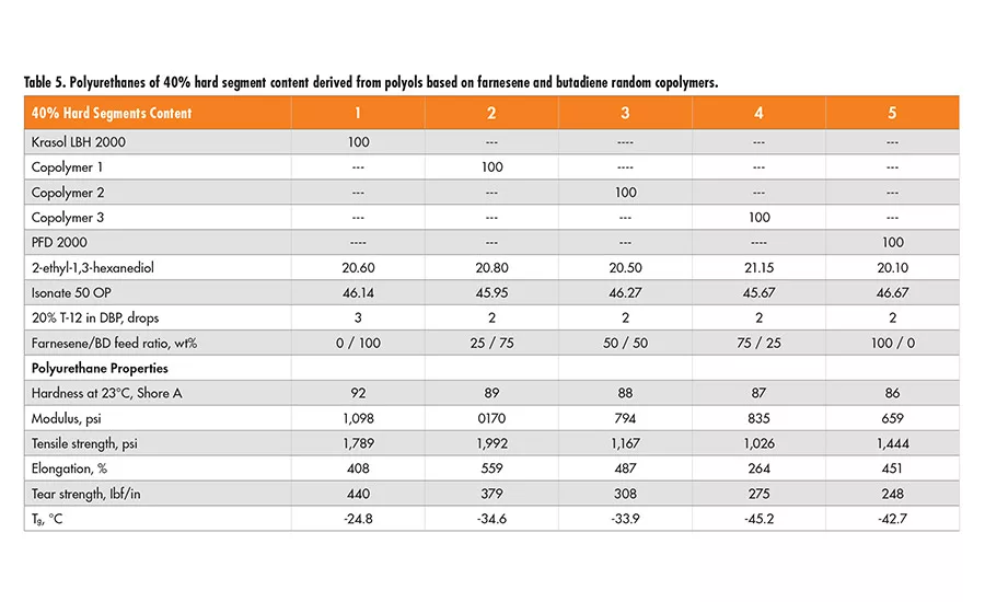 In polyurethane formulas, the purpose of chain extenders is to establish a polyurethane network through hydrogen bonding, which, in turn, improves the physical properties of the final polymers. It appears that by increasing polyfarnesene diol content in the polyol mixture, the hardness, tensile strength, modulus, tear strength, and Tg of the resulting polyurethane material decrease for both 30% and 40% hard segment.