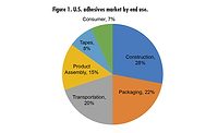 The global market for adhesives and sealants in 2017 reached 34 billion dry lbs, valued at $59 billion. North America represented approximately 30% of the global market. Construction and building-related end uses make up approximately 25% of the market value for adhesives and sealants in the U.S., with about 70% of adhesives and sealants consumed on location in new construction and repair (see Figure 1).