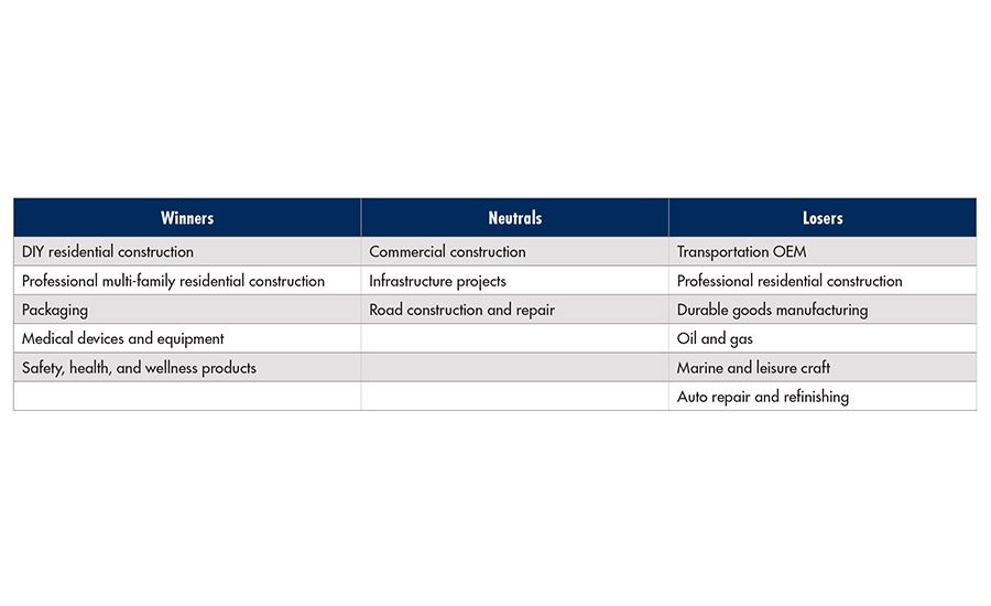 Sectors that use adhesives and sealants are experiencing varying levels of demand due to both the pandemic and massive reductions in oil prices, according to Murad. “We’ve segmented our forecast based on those segments that we believe are going to be winners, those that will be neutral, and those that we believe are going to be losers in the relative short term,” he says.