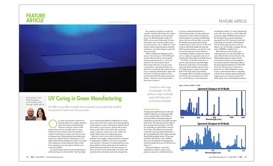 One of the most popular solutions for utilizing adhesives, coatings, polymers, and resins in green manufacturing without resorting to solutions that require time or heat to cure/dry involves using ultraviolet (UV) radiation and a material that is capable of utilizing its energy to provide for a fast, on-demand cure. While mercury-based bulbs have long been a staple of the UV curing process, UV light-emitting diodes (LEDs) have made vast strides in becoming an excellent alternative due to their lower operating costs and superior lifetime over conventional bulbs.