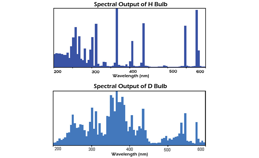 During formulation, a materials manufacturer will use various resins, polymers, pigments, and photoinitiators to create a material that produces a finished product that suits the application requirements while effectively using the spectral output of a readily available light source, like one of those bulbs, to provide the needed curing performance during manufacturing to allow the user of the resin or ink to effectively handle the material. Differing photoinitiators can often be used to tune the material to absorb different wavelengths of light to change the surface cure vs. depth-cure properties and rate of cure based on the output of the bulb chosen.