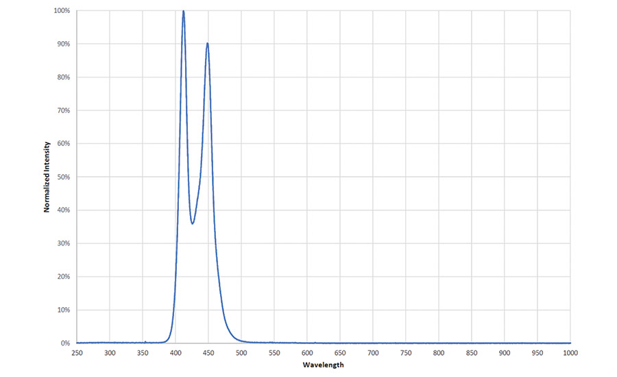 If the material in question is manufactured with a photoinitiator that is not compatible with UV LED curing, it will not cure with most commercially available UV LED curing systems, regardless of its energy output. However, due to the emerging availability of industry-suitable UVB/C LEDs, companies are starting to offer systems featuring multiple wavelengths—including those previously unavailable wavelengths that can provide the missing link between mercury bulb and UV LED outputs. For example, Figure 3 shows an example of a UV/VIS LED curing system’s spectrum with output wavelengths at 415 and 445 nm.