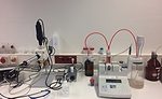 Measurement of TiO2 dispersions was carried out using five TiO2 pigment grades with different post-treatments in aqueous dispersion. Materials included an aqueous TiO2 dispersion 10% wt, 0.1 M HCl, and 0.1 M NaOH (p.A.). Testing was performed with an ESA measuring system incorprating a programmable titrator. A hypersensitive probe with 500 kHz was used to measure frequency. The system also included an ESA measuring cell, pH sensor, conductivity and temperature sensor, and an adjustable stirrer to prevent precipitation during measurement.