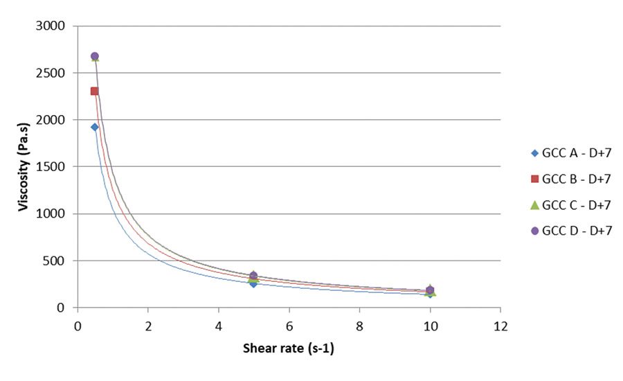 Viscosity profiles of the formulation 1 sealant incorporating the different GCC grades are shown in Figure 1. Sealants produced with GCC C and GCC D (specifically engineered ultrafine GCC grades with low moisture content) exhibited higher viscosities than those containing the other fine and ultrafine GCC grades. It is interesting to note that the sealant produced with GCC C displayed better shear-thinning effect than the one containing GCC B, despite having the same d50 of 2 µm.