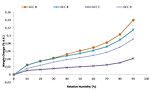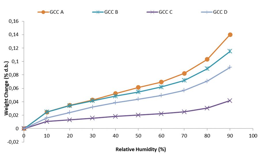 Comparisons of the moisture pick-up profiles of the different GCC grades are shown in Figure 2). GCC C and GCC D display the lowest moisture pick-up, despite being the finest grades tested in this study. It is interesting to note that at the same d50, GCC B displays a higher, “standard” moisture pick-up compared to GCC C.